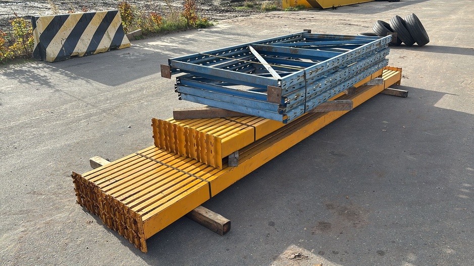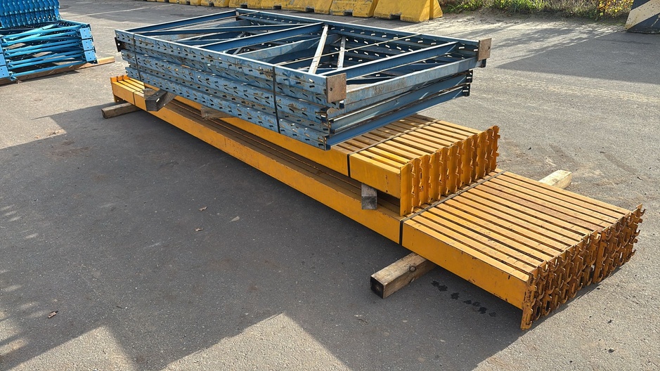 - 16M Palletstelling gebruikt met beschadigingen bestaat uit: 5x staanders 2350x1100mm blauw 14x liggers 4500x120x45mm 12x liggers 3100x120x50mm