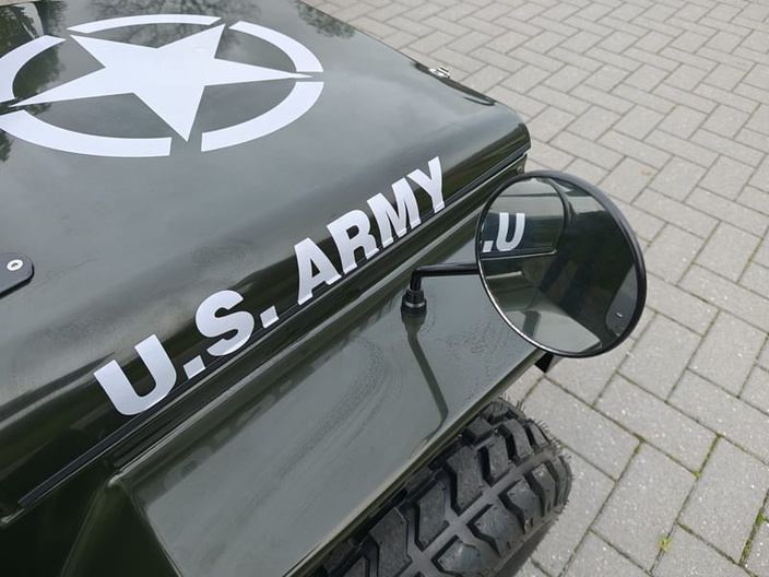 - Ongebruikte Mini Willys Jeep kinderauto met benzinemotor 150 cc terreinwagen met vering, trekhaak en voorruit groen tot 60 km/u, 3 versnellingen vooruit en 1 achteruit, Draagvermogen: tot 200 kg (1 volwassene en 1 kind) Leeggewicht: 180 kg Motor: 150 cc 1 cilinder 4-taktmotor Aandrijving: Ketting, achterwielaandrijving Transmissie: Semi-automatische transmissie 3 versnellingen vooruit 1 neutrale versnelling 1 achteruitversnelling Elektrische starter Accu: 12V/9Ah Ontstekingstype: CDI Tankinhoud: ca. 4 liter Wielbasis: ca. 1070 mm Bodemvrijheid: ca. 90 mm Voor-/achterrem: schijfrem Luchtgekoeld Stuurhoek: >30 Brandstof: Super, alternatief E10
